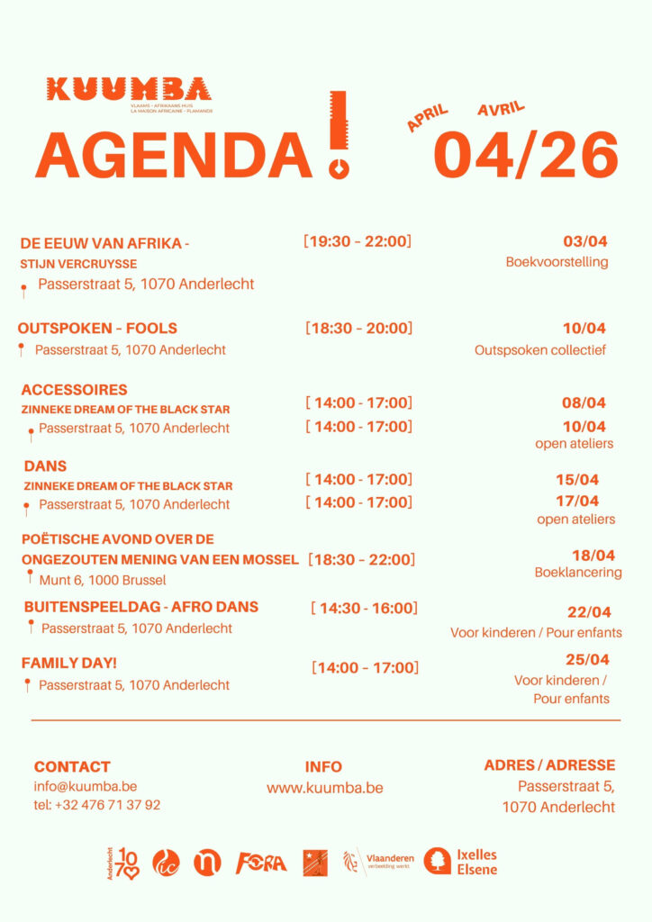 In april zetten we de lijn verder met een warm en gevarieerd programma vol ontmoeting, creatie en verbinding. We starten met de lancering van het boek De eeuw van Afrika van Stijn Vercruysse. Daarnaast is er Outspoken, onze maandelijkse spoken word-avond waar verschillende stemmen samenkomen rond het thema ‘fools’, met ruimte om te schrijven en te delen tijdens de open mic.